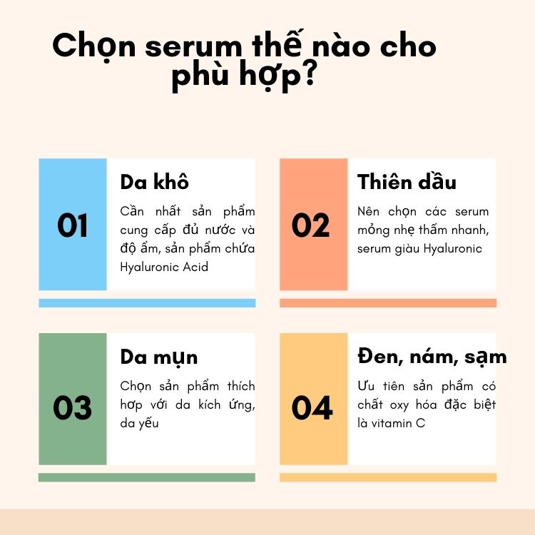 - Tìm hiểu về thành phần của serum: Hãy chọn serum chứa các thành phần dưỡng da phù hợp với nhu cầu của bạn, ví dụ như vitamin C giúp sáng da cho nhóm da không đều màu, Acid Hyaluronic giữ ẩm cho da khô, da thiên dầu, peptide giảm nếp nhăn,…